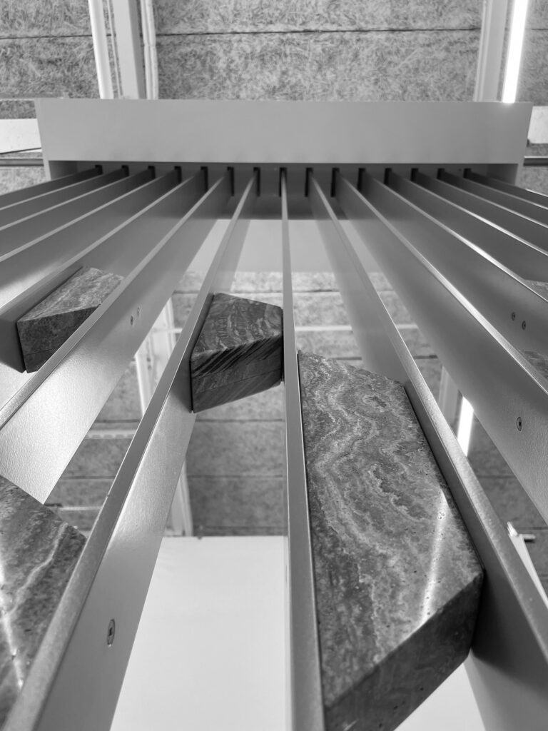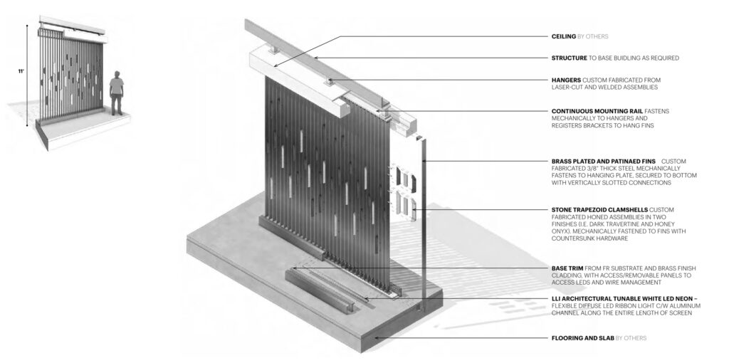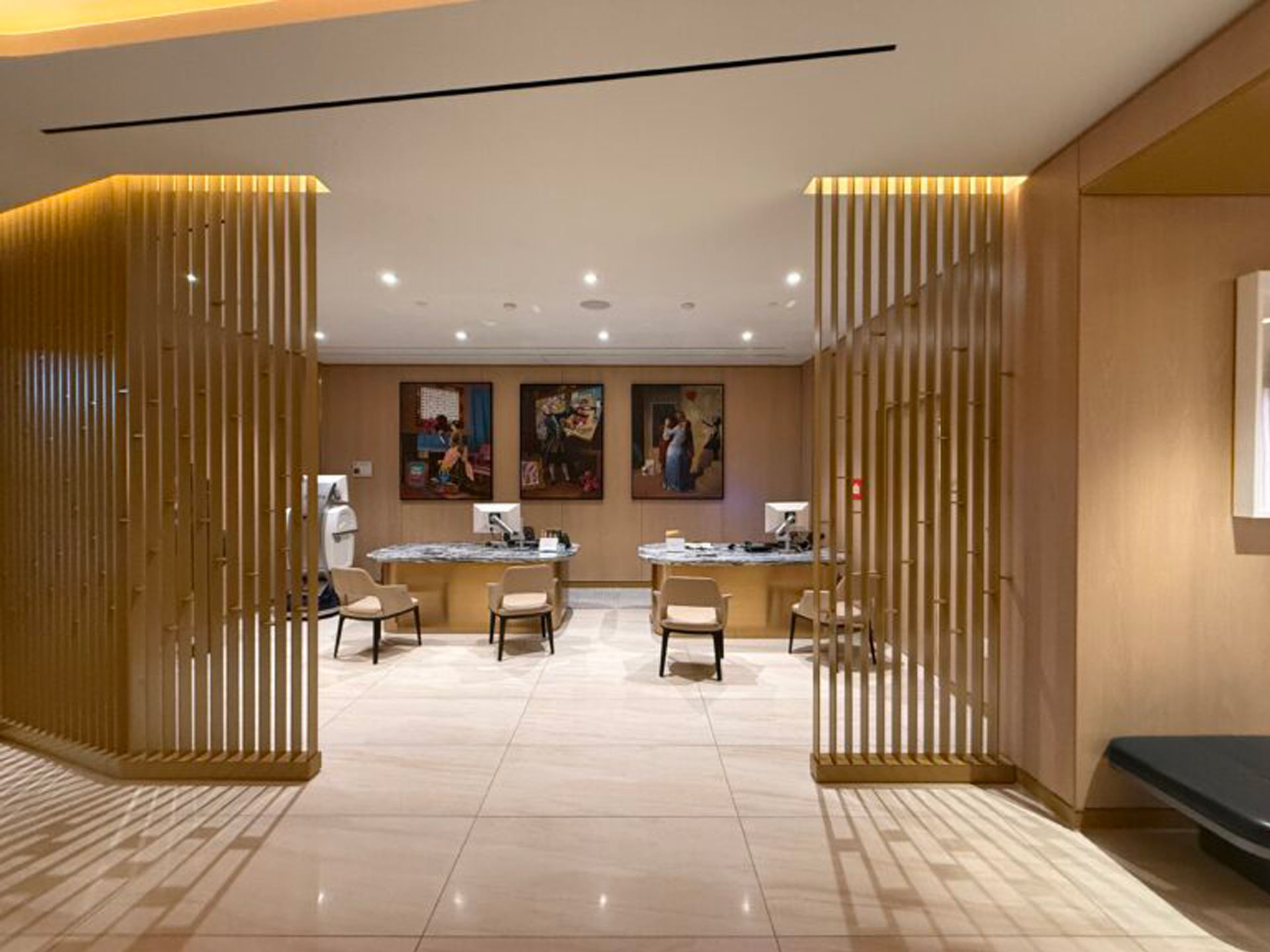 The design features included a beautiful curved white oak storefront entryway and custom partitions and screens with varying combinations of wood, stone and metal finishes with specialized pattern details.