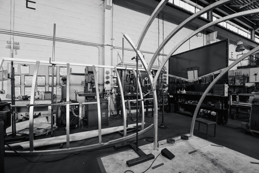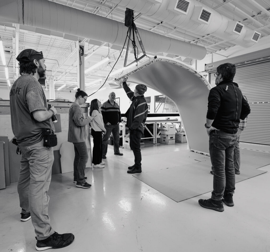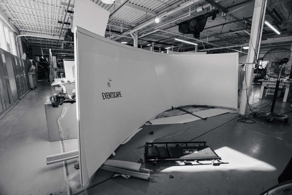 Eventscape realized the Petal Tunnel’s complex ceiling through design, turnkey development, fabrication, and installation. A modular steel strut channel substructure clamp-connects to base building beams, forming a robust framework. From this armature, threaded rods suspend custom-fabricated aluminum tube frames—precision-rolled 2” x 4” members shaped to achieve each petal’s distinctive geometry. A bespoke tensioning system maintains alignment and curvature across varied heights and angles.