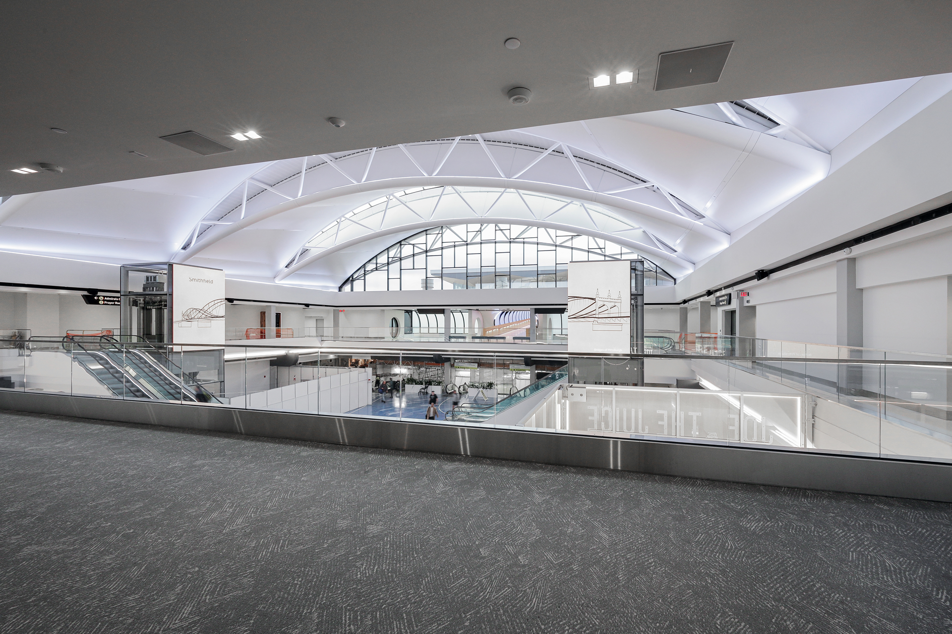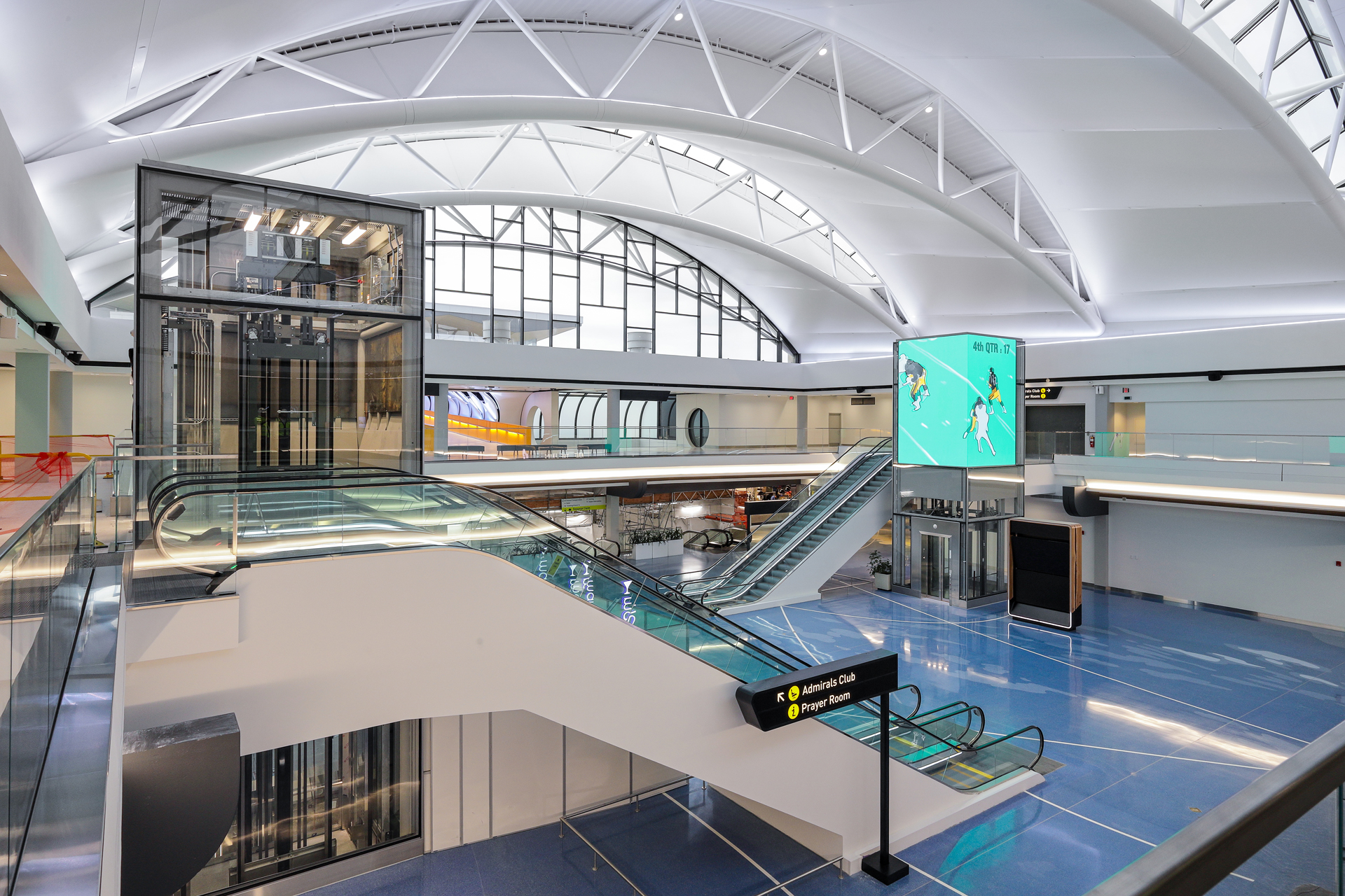 The Petal Tunnel designed by Luis Vidal + Architects and fabricated by Eventscape forms the experiential spine of the expansion. Extending 95 feet in length, 22 feet in width, and 9 feet in height, the pedestrian connector replaces the airport’s former underground train system, unifying landside and airside circulation in one seamless procession.